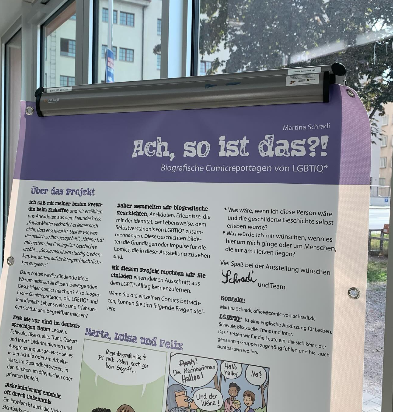 Unter dem Motto “Ach, so ist das?!” sammelt Martina Schradi Geschichten über Lebensweise und Erfahrungen von LGBTI* – Lesben, Schwulen, Bisexuellen, Trans und Intergeschlechtlichen – und zeichnet daraus biografische Comics.
